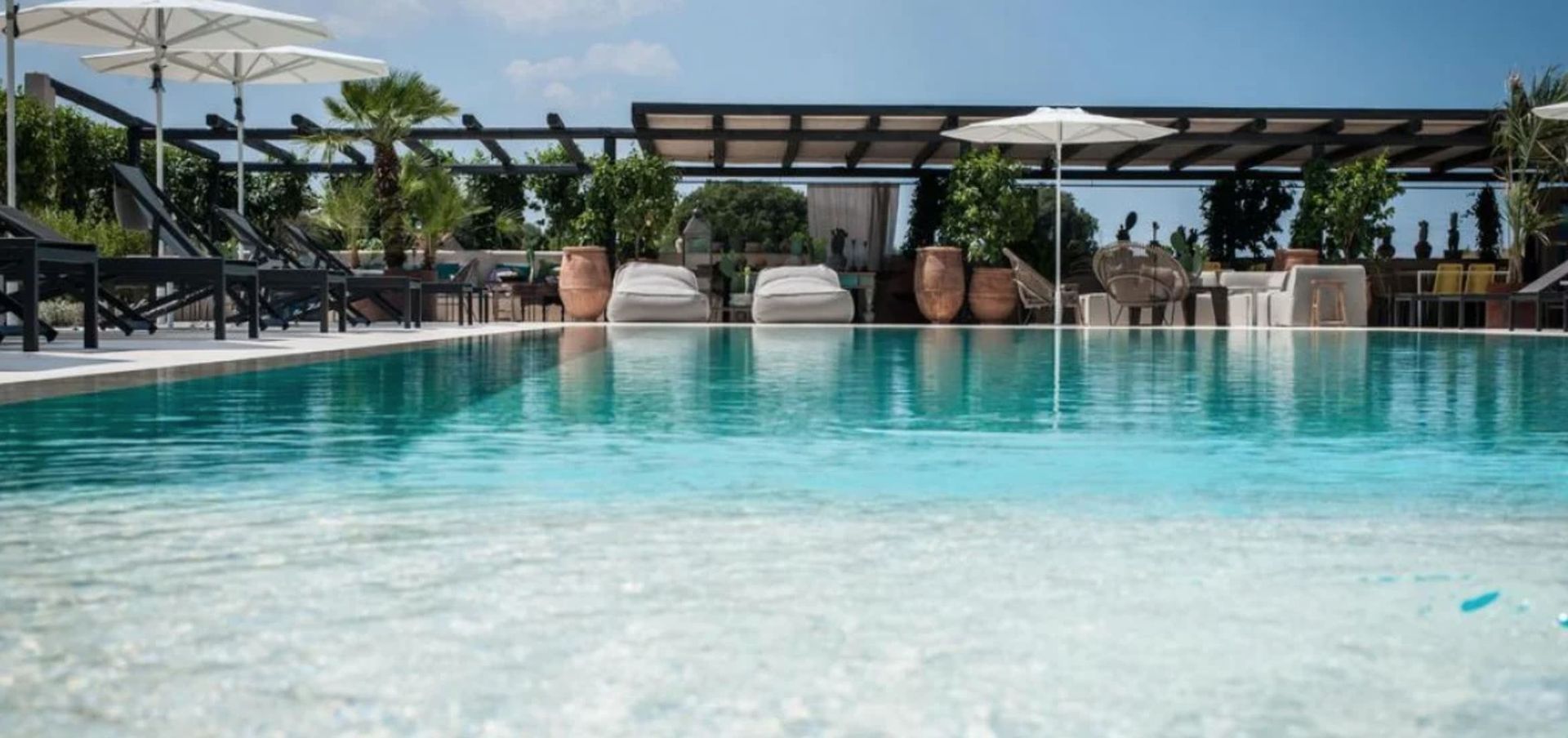 -Outdoor swimming pool surrounded by olive trees
