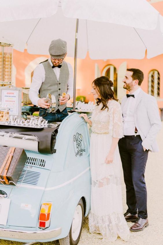 Enter the granita cart! This charming mobile bar overflows with vibrant Sicilian granitas – a semi-frozen dessert made with fruit, sugar, and water. Imagine flavors like tangy lemon, mulberry, or perhaps even a fragrant pistacchio granita. Guests can scoop their own frosty treat, the vibrant colours adding a pop to your wedding photos. It's not just delicious, it's a delightful nod to Sicilian tradition, setting the scene for a fun and festive celebration.
